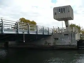 The City solicited a bid for the first swing bridge in 1896.[1] Contractors were allowed to propose either a metal or wood bridge. The Privy Council of Canada approved funding of the bridge in 1900.[2] The two spans were 52 feet (15.85 m) long, which was considered sufficient to accommodate navigation on the river." The wooden bridge was replaced by steel draw bridges in 1912 and 1932.[3]