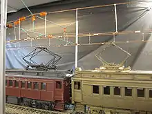 Although the original layout did have a short section of catenary, most of it was destroyed when the layout was torn down.[6] However, the new layout is being constructed with a full PRR-Style compound catenary system over the entire layout. This catenary system is being integrated into the power distribution,[15] so that the electric locomotives and MU cars will receive power via their operating pantographs.[17]