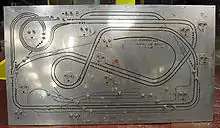 The new layout was started in 2001,[15] is of a double-track looped-8 design; but has been built around the walls, with several reversing loops, curved laminate benchwork, more than 2000 linear feet of track,[16] and a scale model of Philadelphia's 30th Street Station.[15] Scenery has been built with a mix of hydrocal and extruded styrofoam board, and North Coast Engineering (NCE) Digital Command Control has been installed to allow running of multiple trains without the need for complex relay systems.[8][16] The layout also features working signals that display proper occupancy, as well as scale-sized lighting fixtures for night scenes. Additionally, a new On30 narrow gauge branchline is being constructed at one end of the layout, with plans to expand it as time and resources allow.[8] Rolling stock is owned by the individual members,[8][13] with the club jointly owning the layout and control system. This rolling stock represents all periods of history,[15] and is a mixture of brass, bronze, tin, white metal, plastic, resin, wood, paper, cardboard, and die-cast models; most of which has been extensively kitbashed/modified, features custom paint and water-slide decals; and has been weathered to better replicate real-world conditions.[8]