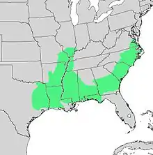 Cherrybark oak has a disjunct (discontinuous) distribution. It is common in the Carolinas and in the lower Mississippi Valley but rare in Georgia and Florida in between. There are also scattered, outlying populations as far north as New Jersey and as far west as Texas and Oklahoma.[4]