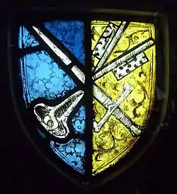 ![]() Medieval stained glass with the arms of the abbey, a sword and the keys of St Peter | |