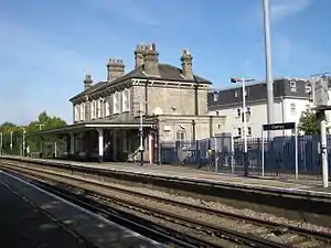 The first station was opened by the London and South Western Railway, with the initial section of the Chertsey branch line, in 1848. The existing building, now a Grade II listed building, was opened on 1 October 1866. It comprises Up and Down platforms having brick buildings: the main building being on the Down side. There is a level crossing here. The platforms can hold ten carriage trains.