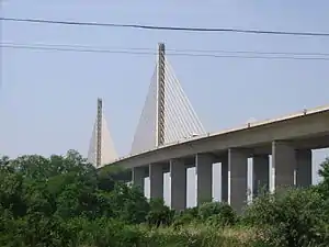 The Senator William V. Roth Jr. Bridge, the first cable-stayed bridge of its type in the Delaware Valley area (all previous Delaware River or C & D Canal bridges are either suspension, cantilever, or simple truss designs), is also the first pre-cast concrete bridge to be built in the United States.[2] Modeled after that of the Sunshine Skyway Bridge in St. Petersburg, Florida, the bridge incorporates many features not found on the other canal bridges: