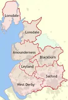 - Roger de Poitou (for over 50 places including West Derby, Leyland, Blackburn, Manchester, Rochdale, Salford and Warrington), son of Roger de Montgomery. He was one of William the Conqueror's main advisers. King Henry I confiscated all of his land between the River Ribble and the River Mersey, after Roger and his brothers' failed rebellion in 1102.[7]