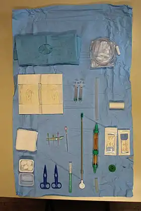Drainage of the pericardium can be achieved by puncture (transcutaneously) or surgically. In the first case, small-bore catheters not suitable for the drainage of blood (e.g. hemopericard) are used. Pericardial drains are mostly used with the help of gravity. As a pericardial drain is placed surgically, a largo bore drain is used with a decreased probability of clogging.