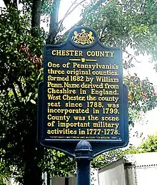 Philadelphia, Bucks, and Chester were the three Pennsylvania counties initially created by William Penn on August 24, 1682.[5][6] At that time, Chester County's borders were Philadelphia County to the north, the ill-defined western edge of the colony (approximately the Susquehanna River) to the west, the Delaware River to the east, and Delaware and Maryland to the south. Chester County replaced the Pennsylvania portion of New Netherland/New York’s "Upland", which was officially eliminated when Pennsylvania was chartered on March 4, 1681, but did not cease to exist until June of that year.[7][8] Much of the Welsh Tract was in eastern Chester County, and Welsh place names, given by early settlers, continue to predominate there.