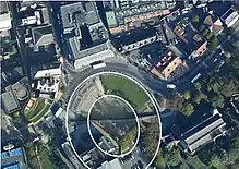 | The location of the amphitheatre within Chester, showing the curved road that surrounds the perimeter. |