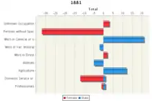 The occupational data of Chesterton in 1881, shown in the graph to the right, presents the majority of females as not having a " Specified Occupation". Compare this to the side which presents data for the male population in Chesterton in 1881, it presents all of the males within the village being in some sort of recognised occupation.[19]