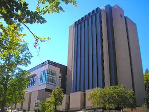 Between 1910 and 1971, the site of Chevron Science Center had been occupied by the former State Hall, the first building erected upon Pitt's move in the early 20th century to the Oakland campus and at various times home to the university's library, administration, and engineering department.[2] Chevron Science Center's $14.7 million cost ($89.7 million today) was partially offset by a $2 million grant ($13 million today) from the National Science Foundation. Its completion brought together under one roof many chemistry facilities that were, at the time, scattered among eight different buildings on Pitt's campus.[3] Upon its completion, it was the largest school building for chemistry instruction and research east of the Mississippi River.[4] The building also received a second place award in the "Lab of the Year" contest conducted by Industrial Research magazine.[5] It contains a 500-seat auditorium dedicated to Lauren H. Ashe, a 1914 Pitt alumnus who was a pioneer in the pharmaceutical industry.[4]