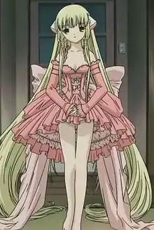 Chi makes several appearances in Tsubasa: Reservoir Chronicle,[30][31] and is voiced by in the anime by: Kaori Nazuka (Japanese version) and Trina Nishimura (English version). In this crossover series, she is created by Fai D. Flourite as a guardian of the pool where his brother's body, and eventually the sealed Ashura-ou are kept. Fai modeled Chi after his memories of his mother, and was created using one of Princess Sakura's feathers. Chi eventually disintegrates after the feather is removed and given back to Sakura. Another version of Chi appears in episode 32 of the anime where she is the queen of a world that is in a never-ending night. Chi's character is also cosplayed in the anime adaptation of Hanaukyo Maid Team: La Verite. While trying to sell manga at the "Comic manga market", Ikuyo Suzuki has the cast of characters cosplay and Mariel goes as Chi.[32]