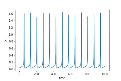 in which, is called activation or action potential variable, and is the recovery variable. The model has four parameters, is a time-dependent additive perturbation or a constant bias, is the time constant of recovery , is the activation-dependence of the recovery process and is an offset constant. The model has a rich dynamics, presenting from oscillatory to chaotic behavior,[4][5] as well as non trivial responses to small stochastic fluctuations.[6][7]
