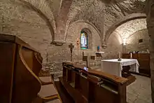 The interior of the church is Latin cross in shape. It is divided into one nave and two aisles by pilasters, crowned by Romanesque capitals.