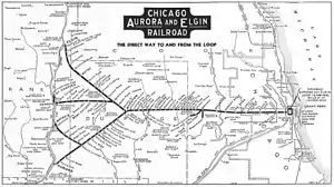 ![]() Map of the Chicago Aurora and Elgin Railroad from a 1936 public timetable folder | |