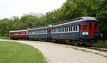 The loss of one-seat commuter service to the Loop devastated the interurban. The railroad's financial condition was already shaky, and schemes to restore downtown service faced various legal or operational obstacles. As early as 1952, the railroad had sought to substitute buses for trains,[36] and after years of financial losses, in April 1957 the Illinois Commerce Commission authorized the railroad to discontinue passenger service.[37] Passenger groups and affected municipalities sought injunctions that forced the railroad to temporarily continue service, but as soon as court rulings cleared the way, management abruptly ended passenger service, at noon on July 3, 1957. Commuters who had ridden the CA&E into the city found themselves stranded when they returned to take the train home. Freight operations continued for two more years until June 10, 1959. No trains ran after this point, but the right-of-way and rolling stock were preserved in the event that a party stepped forward to purchase the property. The official abandonment of CA&E came at 5:00pm on July 6, 1961, four years after the final passenger trains had run. The real estate became part of the Aurora Corporation of Illinois, a small conglomerate, which slowly sold off the right-of-way and other properties.[38] Portions of the right-of-way are now operated as a multi-use trail called the Illinois Prairie Path.[39]
