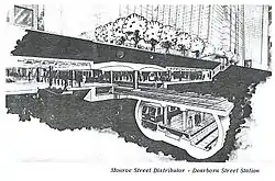 Stations planned for the distributor system were to be located at Harrison/Morgan-UIC, Halsted/Monroe, Clinton/Monroe, Franklin to Michigan (12-foot continuous side platforms with mezzanines at each cross street; 3 station stops were to be made at Wells/Monroe, Clark/Monroe, and Wabash/Monroe), Stetson/Randolph, Grand/Fairbanks, Erie/Fairbanks, Chestnut, Hancock, Rush, and Water Tower. The McCormick branch was to serve the Museums and Soldier Field (today's Museum Campus) and McCormick Place Convention Center.