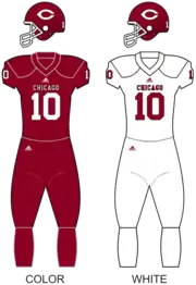 The Chicago Maroons football team represents the University of Chicago in college football. The Maroons, which play in NCAA Division III, have been a football-only member of the Midwest Conference since 2017.[4] The University of Chicago was a founding member of the Big Ten Conference and the Maroons were coached by Amos Alonzo Stagg for 41 seasons. In 1935, halfback Jay Berwanger became the first recipient of the Downtown Athletic Club Trophy, later known as the Heisman Trophy. In the late 1930s, university president Robert Maynard Hutchins decided that big-time college football and the university's commitment to academics were not compatible.[5] The university abolished its football program in 1939 and withdrew from the Big Ten in 1946. Football returned to the University of Chicago in 1963 in the form of a club team, which was upgraded to varsity status in 1969. The Maroons began competing in Division III in 1973.