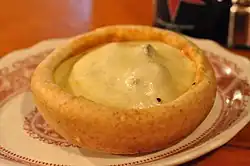 Chicago Pizza and Oven Grinder Company is the original creator of their non-traditional inverted dish known as the Pizza Pot Pie.[5] The same recipe has been used since the restaurant first opened in 1972.[5] It is "made up from scratch" with a tripled-raised Sicilian bread type of dough, baked upside-down,[6] then brought to the table and flipped over "Dairy Queen blizzard-style".[7] The pizza pot pie includes a plum tomato sauce, sausage made from Boston butts, button-sized mushrooms and cheese inside the crust. They also have a vegetarian option that includes the option of white or wheat crust. The Pizza Pot Pie has individual servings that come in two sizes: half-pound or one-pound.[5]