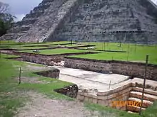 The Tzompantli, or Skull Platform (Plataforma de los Cráneos), shows the clear cultural influence of the central Mexican Plateau. Unlike the tzompantli of the highlands, however, the skulls were impaled vertically rather than horizontally as at Tenochtitlan.[44]