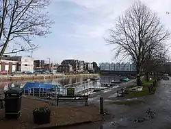 The Chichester Canal is a ship canal in England, currently navigable at either end, save for two low-level modern bridges obstructing the middle of the route. Its course is essentially intact, 3.8 miles (6.1 km) from the sea at Birdham on Chichester Harbour to Chichester through two locks. The canal (originally part of the Portsmouth and Arundel Canal) was opened in 1822 and took three years to build. The canal could take ships of up to 100 long tons (100 t). Dimensions were limited to 85 feet (26 metres) long, 18 feet (5.5 m) wide and a draft of up to 7 feet (2.1 m).[1] As denoted by the suffix -chester, Chichester is a Roman settlement (Noviomagus Reginorum), and 300 Denarii were unearthed when Chichester Basin was formed in the 1820s.