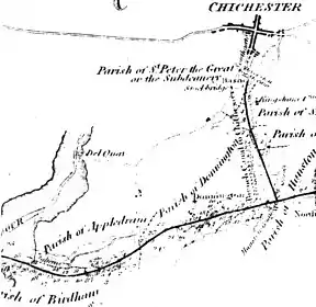 Proposals for a canal linking Chichester directly to the sea go back as least as far as 1585 when an act of parliament was passed allowing a cut linking Chichester with the sea.[2] Further proposals were made in the early 19th century, with schemes being proposed in 1801, 1802, 1803 and 1811, but none of these came to pass and as a result the first link to the sea was via a branch of the Portsmouth and Arundel Canal opened in 1822.[2] In 1817 it had been decided that the section between Chichester and Chichester Harbour, unlike the rest of the canal, would be built large enough to carry boats of 100 tons.[2] Putting this into practice required a new act of parliament which was obtained in 1819.[3] In the same year the construction of the Chichester branch began.[4] In digging out of the basin a hoard of 300 Denarii was found.[5] The section of the canal that would become the Chichester Canal was formally opened on 9 April 1822[6]
