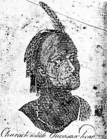 The name Chickasaw, as noted by anthropologist John Swanton, belonged to a Chickasaw minko', or leader.[5] "Chickasaw" is the English spelling of Chikashsha (Muskogee pronunciation: [tʃikaʃːa]), meaning "comes from Chicsa". In an 1890 extra census bulletin on the Cherokee, Chickasaw, Choctaw, Muskogee, and Seminole, a history of the Choctaw and Chickasaw was included that was written by R.W. McAdam. McAdam claimed that the word "Chikasha" meant "rebel" in the Choctaw language.[6] Spanish explorer Hernando de Soto had recorded the people as Chicaza when his expedition came into contact with them in 1540; the Spanish were the first known Europeans to explore the North American Southeast.[7][8]