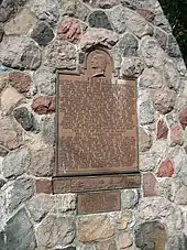 Various rumors quickly spread about the circumstances of Pontiac's death, including one that the British had hired his killer. Benjamin Drake, writing in 1848, records that the Michigamie, along with the other bands in the Illinois Confederation, had been attacked by a general confederation of the Sauk, Fox, Kickapoo, Sioux, Chippewa, Odawa, and Potawatomi, along with the Cherokee and Choctawa from the south. The war continued for a great many years until the Illinois Confederation was destroyed. Drake records that by 1826, only about 500 members of the Confederation remained. Lieutenant Pike, in his travels to the sources of the Mississippi, remarked, "By killing the celebrated Sauk chief, Pontiac, the Illinois, Cahokias, Kaskaskias, and Peorias kindled a war with the allied nations of the Sauks and Reynards, which has been the cause of the almost entire destruction of the former nations."[27] According to a story recorded by historian Francis Parkman in The Conspiracy of Pontiac (1851), a terrible war of retaliation against the Peoria resulted from Pontiac's murder. This legend is still sometimes repeated, but there is no evidence that there were any Indian reprisals for Pontiac's murder.[28][29][30] Pontiac's burial place is unknown, and may have been at Cahokia. But evidence and tradition suggest that his body was taken across the river and buried in St. Louis, recently founded by French colonists from New Orleans and the Illinois Country.[31] In 1900, the Daughters of the American Revolution placed a commemorative plaque on a parking garage at the corner of Walnut and S Broadway in St. Louis, which was said to be near Pontiac's burial place.[32][33]
