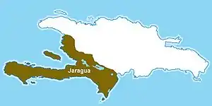 The cacicazgo of Jaragua spanned the entire south-west of the island of Hispaniola. It was bordered on the north by the cacicazgo of Marién, south by the Caribbean Sea, east by the cacicazgo of Maguana, and west by the Strait of Jamaica. It was ruled by the cacique Bohechio (Beehechio)[2] and was the largest of the cacicazgos. Its center was located in a place called Guava, present-day Léogâne in Haiti. It was divided into 26 nitaínos.