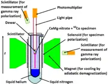 Wu chose to do this by taking a sample of radioactive cobalt-60 and cooling it to cryogenic temperatures with liquid gases. Cobalt-60 is an isotope that decays by beta particle emission, and Wu was also an expert on beta decay. The extremely low temperatures were needed to reduce the amount of thermal vibration of the cobalt atoms to almost zero. Also, Wu needed to apply a constant and uniform magnetic field across the sample of cobalt-60 in order to cause the spin axes of the atomic nuclei to line up in the same direction. For this cryogenic work, she needed the facilities of the National Bureau of Standards and its expertise in working with liquid gases, and traveled to its headquarters in Maryland with her equipment to carry out the experiments.[94]