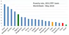 Poverty is widely recognised and acknowledged as the primary cause of child labour.[7][8][9][10][11] The link between poverty and child labour is supported by efforts of international organizations, such as the ILO and the United Nations, to reduce child labour through poverty reduction policies.[8] There is a strong negative correlation between the income level of a country and the incidence rate of child labour. An increase of $0–$500 per capita income to $500–$1000 per capita income can lead to a decrease in child labour incidence rate from 30%–60% to 10%–30%.[7] Although the annual per capita income of Bangladesh has been increasing, around 9–13% of the total labour force in Bangladesh still consists of children aged 5–14.[7][9][10] In a 2013 statistical report, UNICEF estimates that around 43.3% of the population in Bangladesh is currently living below the international poverty line.[12]