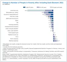 Child poverty in the United States is experienced by a large proportion of kids. As of 1992, children were the largest age group living below the poverty line,[1] and around 1 in 5 children were affected as of 2016.[2] Child poverty is measured using absolute and relative methods. It is caused by many factors, including race, education, and family structure, but ultimately race correlates with these factors. There are multiple effects due to this. Effects on health and development cause lifelong problems and lower educational outcomes, and food insecurity can also be caused by child poverty. The United States government has put in place programs using tax credits and transfers. There are also community programs that have impacted specific communities that have high child poverty rates. For future policies, research suggests that greater investment directed to children and families in poverty and connections between healthcare providers and financial services can lower the child poverty rate.