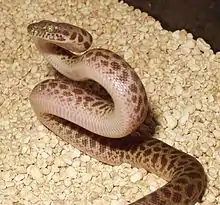 Children's python (Antaresia childreni) is a species of nonvenomous snake in the family Pythonidae. The species is named after John George Children. It is a nocturnal species occurring in the northern half of Australia and generally found on the ground, although it often climbs trees. Usually growing to about 1.0 m (3 ft) in length or more depending on the polymorphic variant, it is typically a reddish-brown colour, darker on the upper surface, and with many darker blotches, especially on younger specimens. The Stimson's python variant has much stronger and more variable colors; often being adorned with reddish-brown to chocolate blotches against lighter tan.[4] It feeds mostly on small mammals and birds, and as with other pythons, it constricts its prey before swallowing it whole. It is a popular pet among reptile enthusiasts.