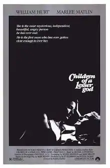 Children of a Lesser God is a 1986 American romantic drama film directed by Randa Haines from a screenplay written by Hesper Anderson and Mark Medoff based on Medoff's 1979 play of the same name. It stars William Hurt, Marlee Matlin (in her film debut), Piper Laurie, and Philip Bosco. The film's narrative follows two employees at a school for the deaf: a deaf custodian and a hearing speech teacher, whose conflicting ideologies on speech and deafness create tension and discord in their developing romantic relationship.[2][3]