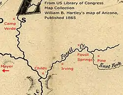 Arizona Power Company—later a part of the Arizona Public Service Company (APS)—began construction of the Childs Power Plant in 1908. Because the land around Fossil Creek consists mainly of mountainous terrain and canyons, and the nearest railroad station was in Mayer, more than 400 mules and 600 men were used to pull more than 150 wagons along the 40-mile (64 km) trail from Mayer to the stream. Most of the workers were Apache and Mojave Indians, who built a dam, powerhouse, and about 8,800 feet (2,700 m) of concrete flumes to carry water to the Childs plant, along the Verde River near the mouth of the creek.[2][3]
