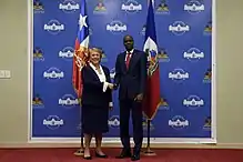 In March 2006, Haitian president-elect, René Préval, visited Chile to attend the inauguration ceremony for Chile's president Michelle Bachelet.[1] In June 2006, President Bachelet visited Haitian President Preval. Bachelet pledged to "continue offering support so that every Haitian has a better chance to have health care, education and housing." Bachelet was the first head of state to visit Haiti since Preval took power in May. Bachelet said that she "would discuss with Preval the possibility of keeping Chilean forces in the country longer if needed, saying a stable Haiti was vital to regional security."[2] In 2017, President Michelle Bachelet paid a visit to Haiti and met with President Jovenel Moïse.