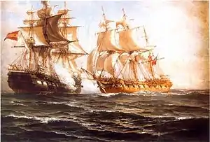 On 26–27 April 1818 she fought against the Spanish frigate Esmeralda and brigantine Pezuela outside Valparaiso. Although the attack on Esmeralda cost Captain O'Brien and his boarding party their lives, Lautaro did succeed in lifting the Spanish blockade of Valparaíso.[19] Later that year Lautaro, under the American, Captain Charles Wooster, was in the squadron under Commodore Blanco Encalada that surprised the relieving Spanish fleet at Talcahuano on 28 October. Lautaro and San Martín captured the Spanish frigate Reina María Isabel (later the Chilean frigate O'Higgins), the Perla, and the San Miguel.[22][23]