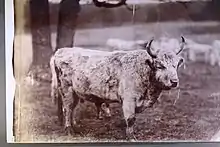 According to earlier publicity material produced by the Chillingham Wild Cattle Association, Chillingham cattle bear some similarities to the extinct ancestral species aurochs, Bos primigenius primigenius, based upon cranial geometrics and the positioning of their horns relative to the skull formation. They further claim that Chillingham cattle may be direct descendants of the primordial ox "which roamed these islands before the dawn of history";.[9][10] It is now considered much more likely that they are descended from medieval husbanded cattle that were impounded when Chillingham Park was enclosed and bones from the present-day herd have been used for comparative purposes by archaeologists.[4] But much remains unknown about their origin.[11] However, the traditional view that these cattle have an unbroken line of descent, without intervening domestication, from the wild-living aurochs was already being called into question in the 1800s.[5] Over the years a large popular literature has built up relating to the herd, which has been analyzed in relation to prevalent concepts of ownership and attitudes of people towards big, charismatic animals.[12] Simon Schama[13] described the famous contemporary woodcut by Thomas Bewick as "an image of massive power ... the great, perhaps the greatest icon of British natural history, and one loaded with moral, national and historical sentiment as well as purely zoological fascination".