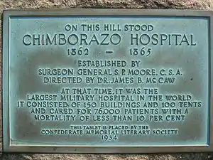 On this hill stood Established by Surgeon General S.P. Moore, C.S.A. At that time, it was the largest military hospital in the world. It consisted of 150 buildings and 100 tents and cared for 76,000 patients with a mortality of less than 10 per cent. This tablet is placed by the |