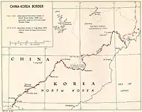 Historically the border areas have been contested by successive Chinese and Korean polities, though the current border utilising the Yalu-Tumen rivers appears to have been in place by the mid 15th century.[3][4] The Manchu (Qing) dynasty of China managed to consolidate control of north-east China (Manchuria) and establish a nebulous 'tributary' rule over Joseon Korea.[4] In 1712 the Chinese Emperor Kangxi and Joseon King Sukjong authorised a border mission to analyse the border alignment in the vicinity of the Yalu-Yumen headwaters on Mount Paektu.[3][5] A pillar was erected indicating the border alignment in this section, and a demilitarised neutral zone set along the frontier.[3][5] In 1875 China, fearful of the Russia presence to the east, occupied its section of the neutral zone.[5] A Chinese-Korean boundary team surveyed the Mt Paektu area in 1885–87, however there were disputes over whether the pillar had been moved, and the two sides were unable to agree precisely which of the several headwater streams should form the frontier.[3][6] In 1889 the Chinese unilaterally demarcated a frontier in the area, marking it with a series of posts, however these were later destroyed by the Koreans.[3] Korea also made periodic claims to Korean-inhabited lands (Jiandao) north of the Tumen.[3]