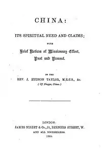 - James Hudson Taylor (1865). China; its spiritual need and claims; with brief notices of missionary effort, past and present. James Nisbet.