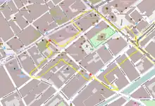 The Hague's Chinatown is located in the city centre, on the Wagenstraat.[1] The entrances of the neighbourhood are marked with two Chinese gates, described as "three meters high with sculptured dragons winding around the pillars and overhead ornate panels of red, gold and blue."[2] Chinatown borders the Spui in the north east, the Bierkade in the south east, the Pavilioensgracht in the south west, and the Gedempte Burgwal in the north west. Important streets in the area include the Wagenstraat (車仔街) and the Sint Jacobsstraat (聖雅各街).