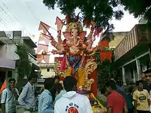 Most of the Muslims in Jalgaon district were originally Hindus from the Maharashtra and north India who, voluntarily or under force, converted to Islam during a period spread over centuries. A few of them are descendants of the Arabs who arrived in the Khandesh region to serve the Faruqi dynasty during 1370-1599. Leaving the past behind, they are all followers of the Islam religion, though the influence of the local culture can be seen in their food, clothes, and housing. Ramzan Eid, Bakri Eid and Eid-e-Milad are the biggest festivals of the Muslims. On Ramzan Eid, it is a tradition of the Muslims to send Sheer khurma for their Hindu friends. Some rich Muslims buy clothes for poor Hindus and this tradition has been maintained over centuries, barring the period of some occasional disturbances in the communal harmony of the village. An azaan is sounded daily by a muzim five times a day from the turret of a masjid as a call to assemble for the namaz. Along with daily namaz, some Muslims also worship Pir Baba. Every Muslim aspires to become a hajji by paying visit to the Mecca in his lifetime.[34] Dalits are emancipated from centuries old oppression in the society because of great efforts from B. R. Ambedkar and as a mark of respect, his birth anniversary, Ambedkar Jayanti, is celebrated like a festival. During the last few decades, statues and photos of Dr. Ambedkar, along with the dhamma flag, have gained immense cultural significance in the landscape of the village.[35]