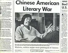 Frank Chin and others have been vocal critics of popular Chinese American authors, particularly Chinese American women authors, such as Maxine Hong Kingston and Amy Tan. Chin argues that Tan and others paint a world in which Chinese Americans must repudiate "the icky-gooey evil of Chinese culture".[6] Others have criticized Chinese American women authors for criticizing sexism in Chinese culture; in so doing, critics argue, these women are participating in the "racial castration" [7] of Chinese and Asian American men, who are already "materially and psychically feminized" by mainstream, white American culture.[8]
