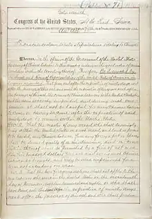 In 1879, however, California adopted a new Constitution which explicitly authorized the state government to determine which individuals were allowed to reside in the state, and banned the Chinese from employment by corporations and state, county or municipal governments.[20] Three years later, after China had agreed to treaty revisions, Congress tried again to exclude working class Chinese laborers; Senator John F. Miller of California introduced another Chinese Exclusion Act that blocked entry of Chinese laborers for a twenty-year period.[21] The bill passed the Senate and House by overwhelming margins, but this as well was vetoed by President Chester A. Arthur, who concluded the 20-year ban to be a breach of the renegotiated treaty of 1880. That treaty allowed only a "reasonable" suspension of immigration. Eastern newspapers praised the veto, while it was condemned in the Western states. Congress was unable to override the veto, but passed a new bill reducing the immigration ban to ten years.[21][22] The House of Representatives voted 201–37, with 51 abstentions, to pass the act.[23] Although he still objected to this denial of entry to Chinese laborers, President Arthur acceded to the compromise measure, signing the Chinese Exclusion Act into law on May 6, 1882.[21][22]