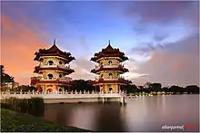 Chinese Garden (traditional Chinese: 裕華園; simplified Chinese: 裕华园; Malay: Taman Cina; Tamil: சீனத்தோட்டம்) is a park in Jurong East, Singapore. Built in 1975 by the JTC Corporation and designed by Prof. Yuen-chen Yu, an architect from Taiwan, the Chinese Garden's concept is based on Chinese gardening art. The main characteristic is the integration of architectural features with the natural environment. The Chinese Garden is modeled along the northern Chinese imperial style of architecture and landscaping.[1] It is located next to Chinese Garden MRT station and connected to the adjacent Japanese Garden by a bridge. Along with Japanese Garden, the two gardens are collectively known as the Jurong Gardens.