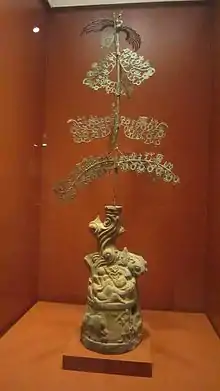 Charms with inscriptions such as fú dé cháng shòu (福德長壽) and qiān qiū wàn suì (千秋萬歲, 1,000 autumns, 10,000 years)[17] were first cast around the end of the Northern dynasties period and continued through the Khitan Liao, Jurchen Jin and Mongol Yuan dynasties. During the Tang and Song dynasties, open-work charms began to include images of Chinese dragons, qilin, flowers and other plants, fish, deer, insects, Chinese phoenixes, fish, and people. The open-work charms from this era were used as clothing accessories, adornment, or to decorate horses. The very common charm inscription cháng mìng fù guì (長命富貴) was introduced during the Tang and Song dynasties, when the reverse side of these talismans started showing Taoist imagery such as yin-yang symbols, the eight trigrams, and the Chinese zodiacs. During the Song dynasty, a large number of Chinese talismans were cast, especially horse coins which were used as gambling tokens and board game pieces. Fish charms meant to be worn around the waist were introduced during the reign of the Khitan Liao. Other new types emerged during the Jurchen Jin dynasty, with the influence of the steppe culture and arts of the Jurchen people. The Jin dynasty merged the Jurchen culture with Chinese administration, and the charms of the Jin dynasty innovated on the talismans of the Song dynasty which used hidden symbolism, allusions, implied suggestions, and phonetic homonyms to describe a meaning. Under the Jurchens, new symbolisms emerged: a dragon representing the emperor, a phoenix representing the empress, tigers representing ministers, lions representing the government as a whole, and cranes and pine trees that symbolized longevity. Hidden symbolism such as jujube fruits for "morning or early" and chickens symbolizing "being lucky" also emerged under the Jurchens.