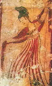 The imperial court from the Qin dynasty onward established various departments responsible for the collection of music and dances, training of performers as well as their performances at the court, such as the Music Bureau and Royal Academy.[2] During the Six Dynasties era (220 - 589 CE), there were strong influences from Central Asia in music and dance. The art of dance reached a peak in the Tang dynasty, and the dances of the period were highly diverse and cosmopolitan, dances from Central Asia, in particular, were popular. A great number of dances were recorded in the Tang dynasty. For example, there are over 60 Grand Compositions alone, which are large-scale performances from the Tang court, and there were tens of thousands of musicians and dancers at the Imperial palaces.[3]