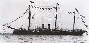 Her initial armament consisted of two 8.2 in (21 cm) breach-loading Armstrong guns, alongside eight 4.7-inch (12 cm) breach-loading Armstrong guns and some Hotchkiss guns.[2] The two larger guns were mounted in sponsons ahead of the funnels, while the smaller Armstrongs were placed amidships as a broadside, on the forecastle and poop deck and in further sponsons ahead of the poop.[3] Although the ship was launched in Germany, that armament was added by Armstrong Whitworth while Nan Chen was at its shipyard in Elswick, England.[2] By 1884, she was equipped with a torpedo boat.[4]