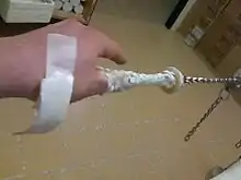 One variation on the Chinese finger trap has uses in orthopedic medicine—namely, providing even pressure to the patient's digit(s) and at the same time immobilizing the joints—and serves a similar purpose as a traction device. Its development goes back to Austria in 1870 when Dr. Steinberger, a dentist at the Rudolfsspital in Vienna, reported the discovery of his doctoral student Schmall, who got the idea to use the toy ″Mädchenfänger" (girl catcher) for the extension of fingers and arms.[1] The principle was adapted for the use in surgery,[3] and already in 1873 termed "Schmall'sches Extensionsgeflecht".[4]