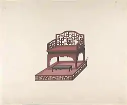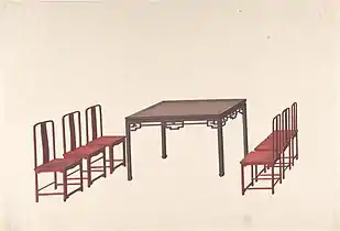The forms of Chinese furniture evolved along three distinct lineages which dates back to 1000 BC,[1] based on frame and panel, yoke and rack (based on post and rail seen in architecture) and bamboo construction techniques. Chinese home furniture evolved independently of Western furniture into many similar forms including chairs, tables, stools, cupboards, cabinets, beds and sofas. Until about the 10th century CE the Chinese sat on mats or low platforms using low tables, in typical Asian style, but then gradually moved to using high tables with chairs.[2]