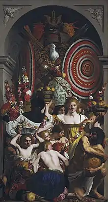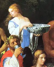 In Italy, the first known depiction of Chinese porcelain bowls is from The Feast of the Gods by Giovanni Bellini (1514).[1] The style of the bowls is that of the Ming dynasty blue and white porcelain type, maybe examples of which are known to have been exported in Persia, Syria and Egypt.[1] The painting by Bellini was a request by Duke Alfonso I d'Este, who was known for his interest in Chinese porcelain. It seems that Bellini found samples of the Chinese ware not through trade, but among diplomatic gifts received by Venice from the Mamluke Sultans in 1498 (gift to Doge Barbarigo), and in 1498 and 1508 (gift to the Signoria).[1]